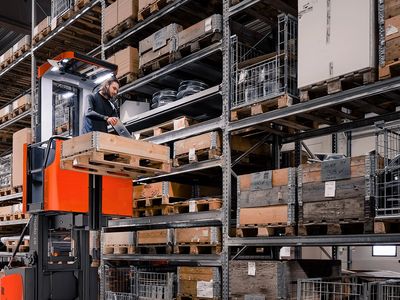 Both trucks let the person go right up to the top shelves to pick boxes by hand.